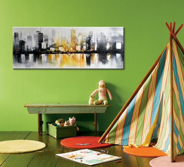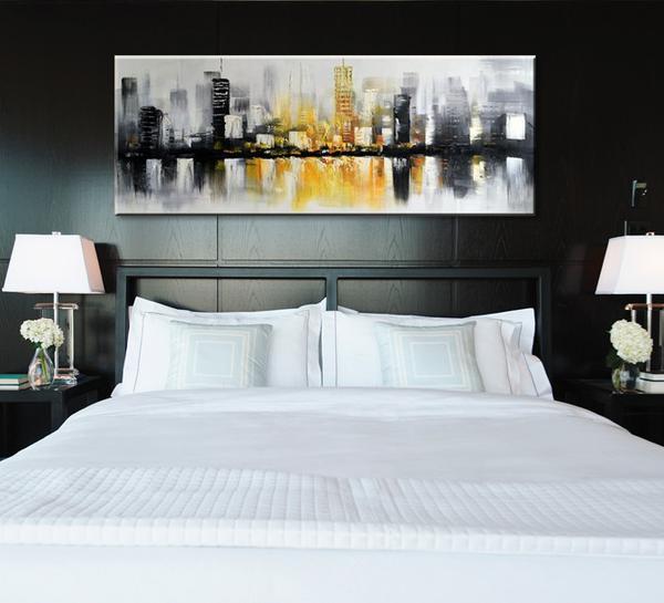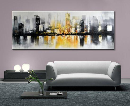 Beautiful abstracted cityscape artwork, featuring a greyscale tonality with a beautiful warm yellow central highlight. Lovely home decor art.