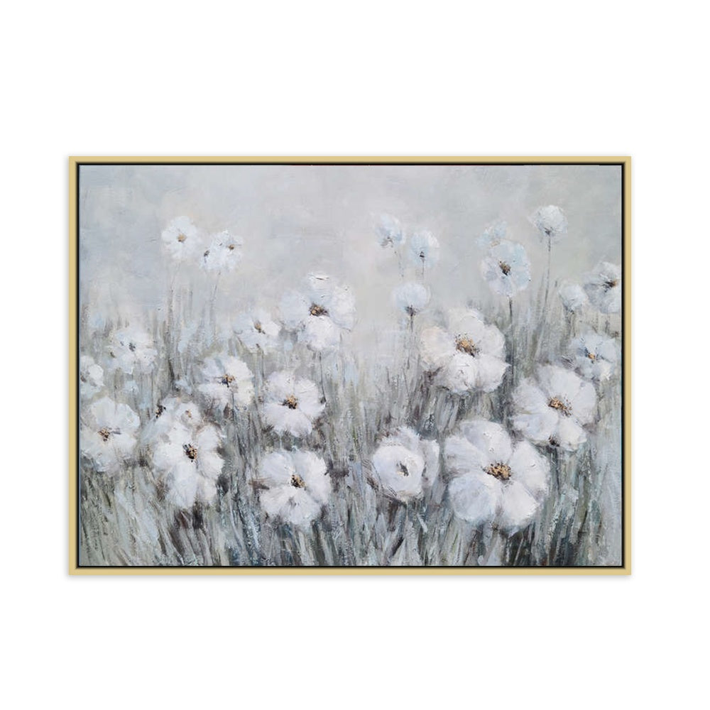 A peaceful embellished canvas print of Buddha in soft grey and gold tones, radiating calm and framed in a gold-coloured shadow frame, sized 75x100cm.