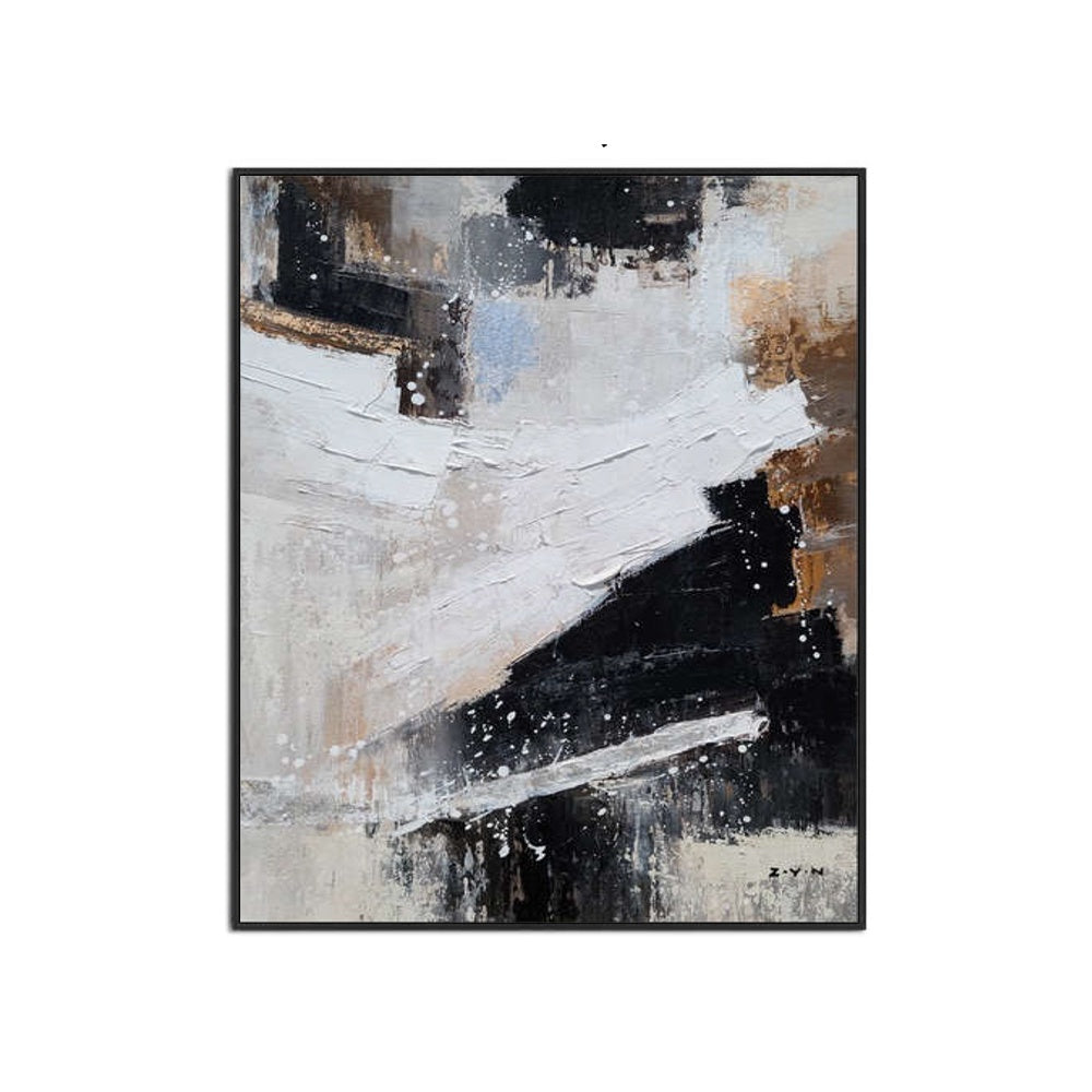 A powerful embellished canvas print blending navy, white, and gold with textured depth and movement, framed in a sleek black shadow frame, sized 75x100cm.
