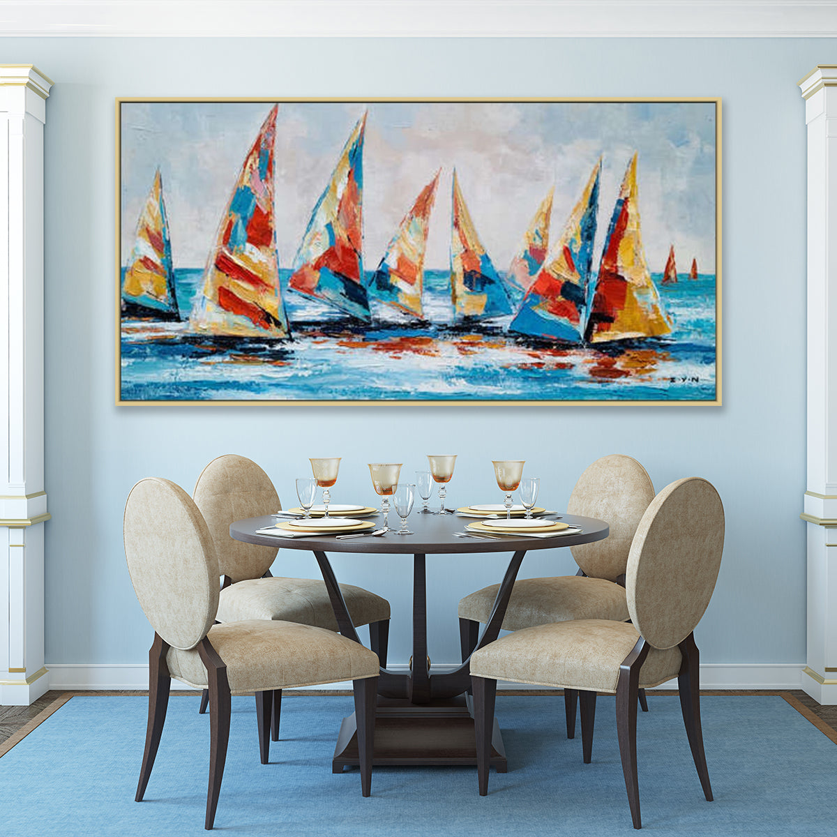 A vibrant embellished canvas print of seaside bathing huts, bursting with bold blues and warm oranges, framed in an oak-coloured shadow frame. Available in sizes 60x120cm and 80x150cm.