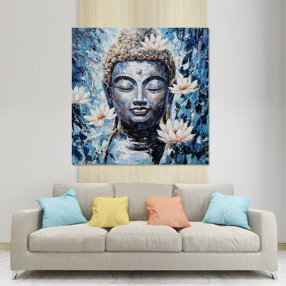 Blue Buddha - Embellished Mixed Media Art - EA347 - 90x90cm