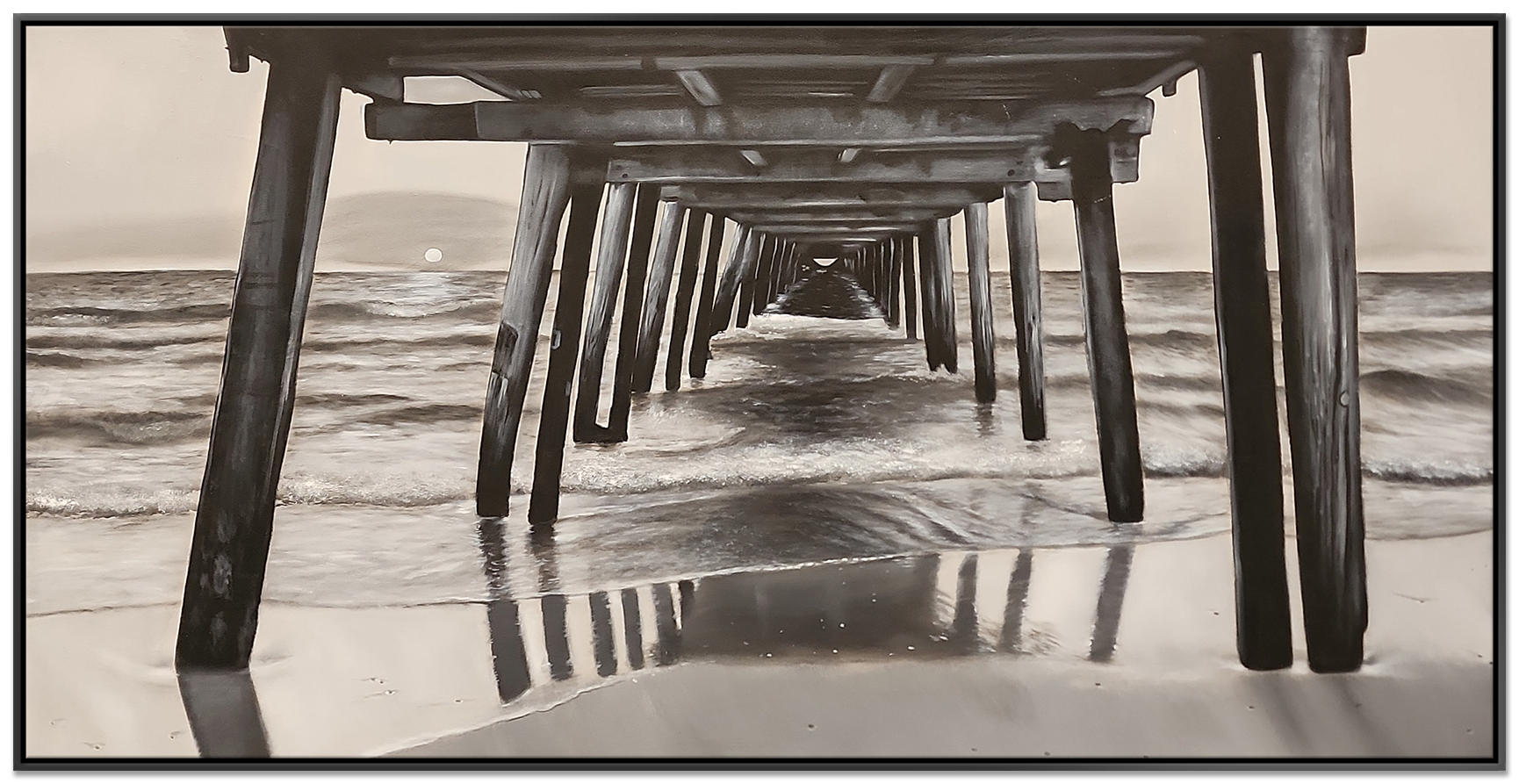 Highly Detailed Oil Painting Featuring the Henley Beach Jetty, Painted in Black and White. Size 100x180cm, and finished with a Black Shadow Frame.