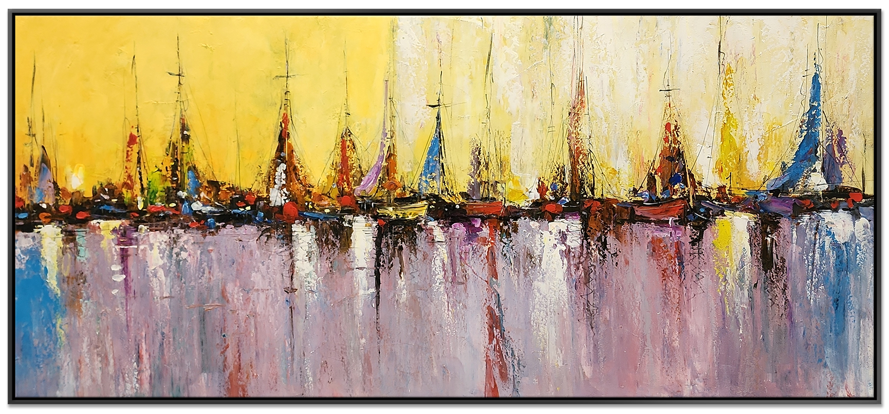 Stunning Modern Impressionistic Seascape Art featuring Boats at Sea, size 80x170cm. Finished with a Black Shadow Frame.