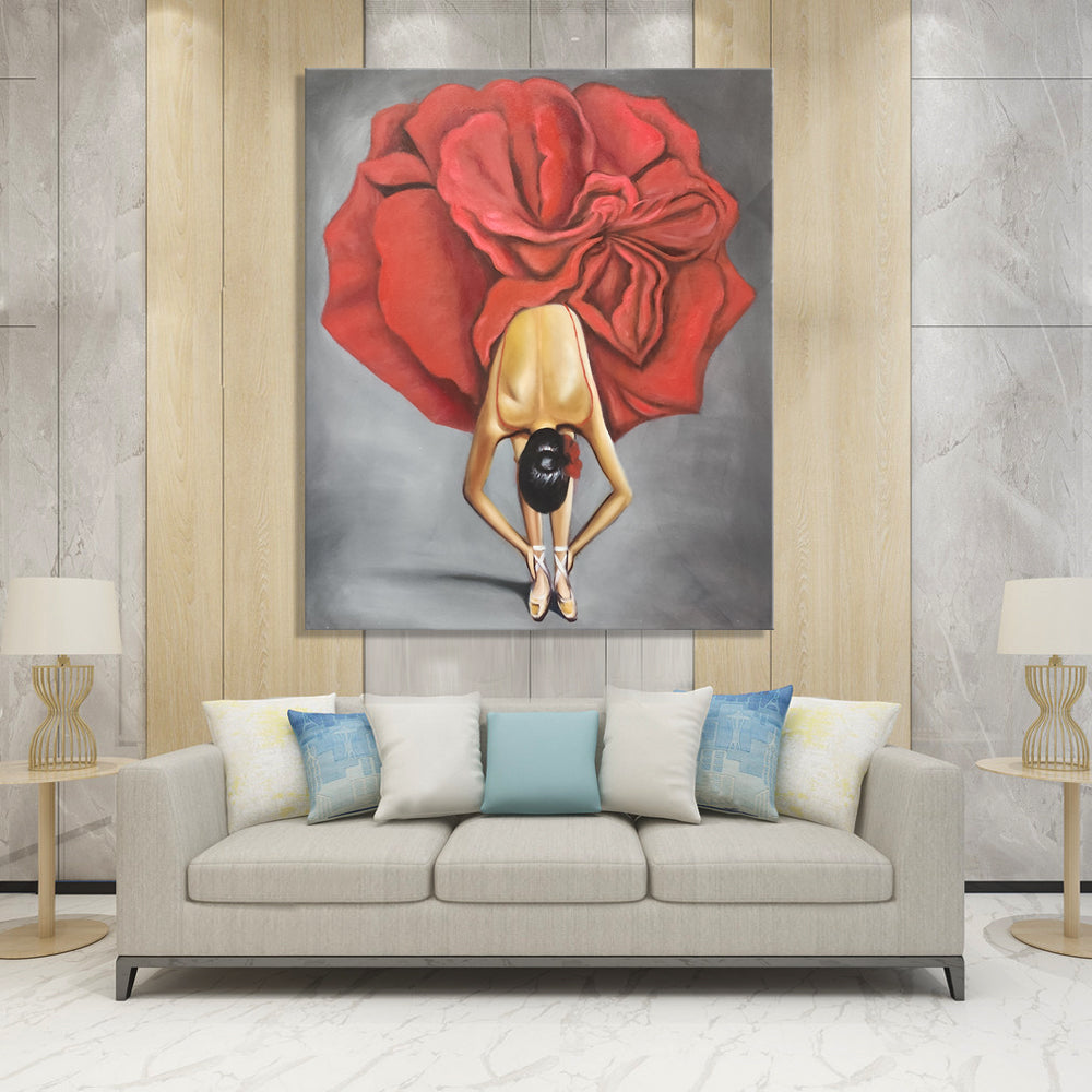 Ballet Bouquet - Stunning, Highly Detailed Depiction of a Ballet Dancer with a Flaring Red Dress Resembling a Rose, Size 100x120cm