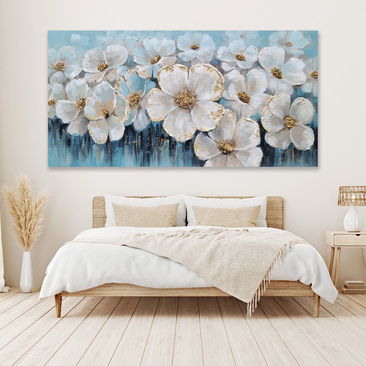 Textural painting of delicate flowers in soft shades of white, grey and silver.