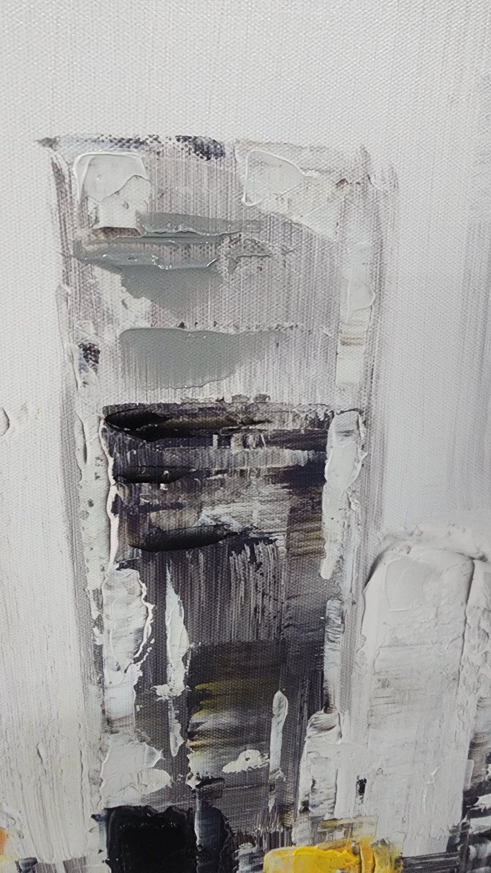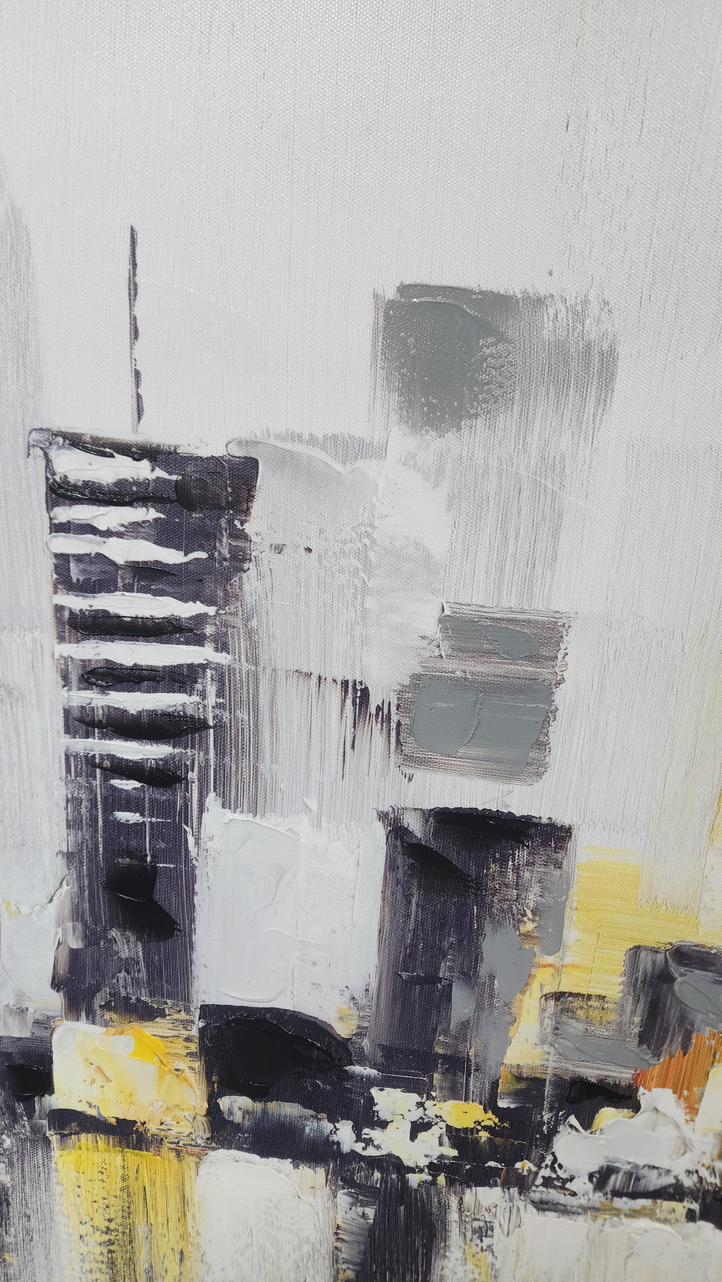 Beautiful abstracted cityscape artwork, featuring a greyscale tonality with a beautiful warm yellow central highlight. Lovely home decor art.