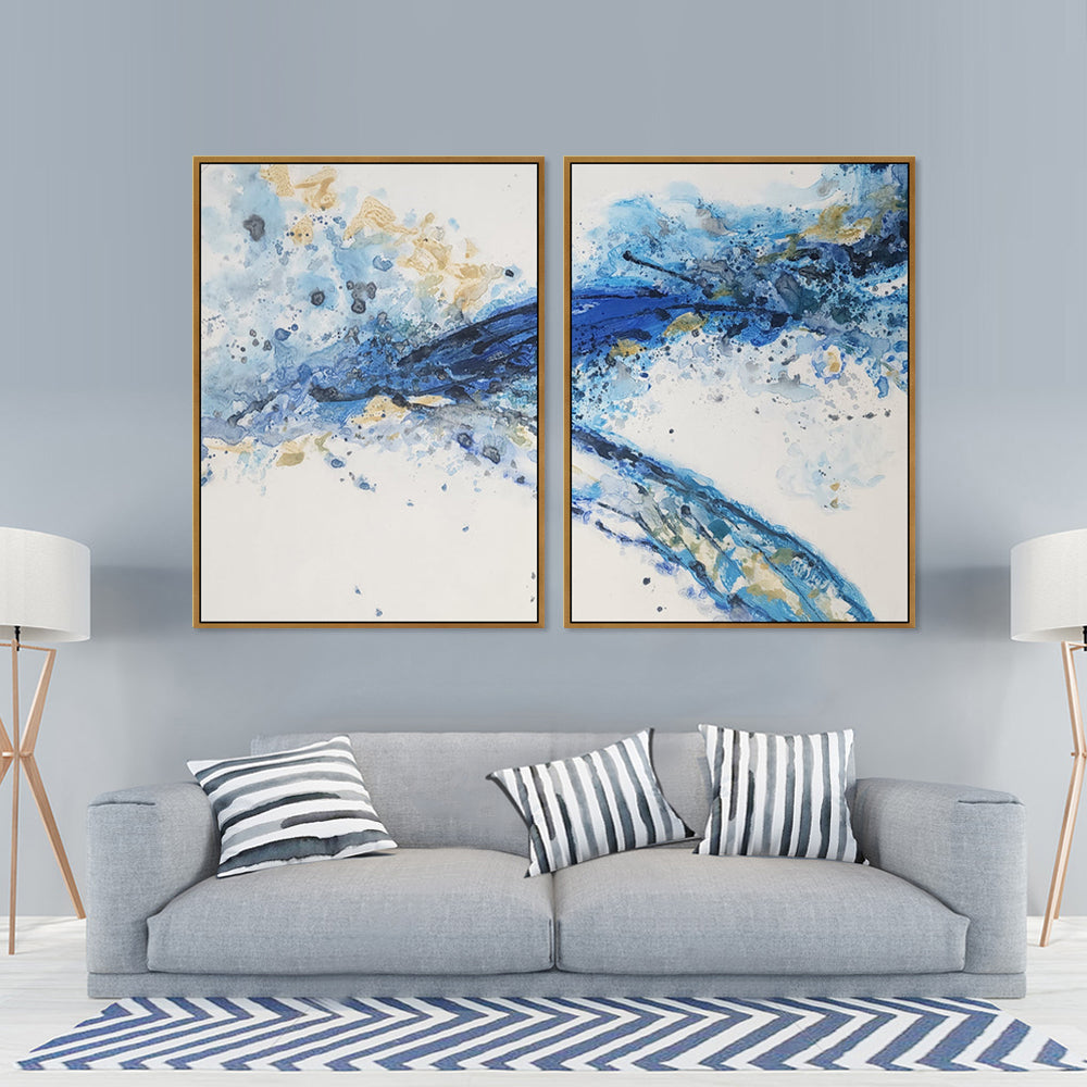 Blue Wake - Striking Modern Abstract Set of 2 Depicting Predominantly Blue and Yellow Tones, Each Fitted in an Oak Frame size 75x100cm