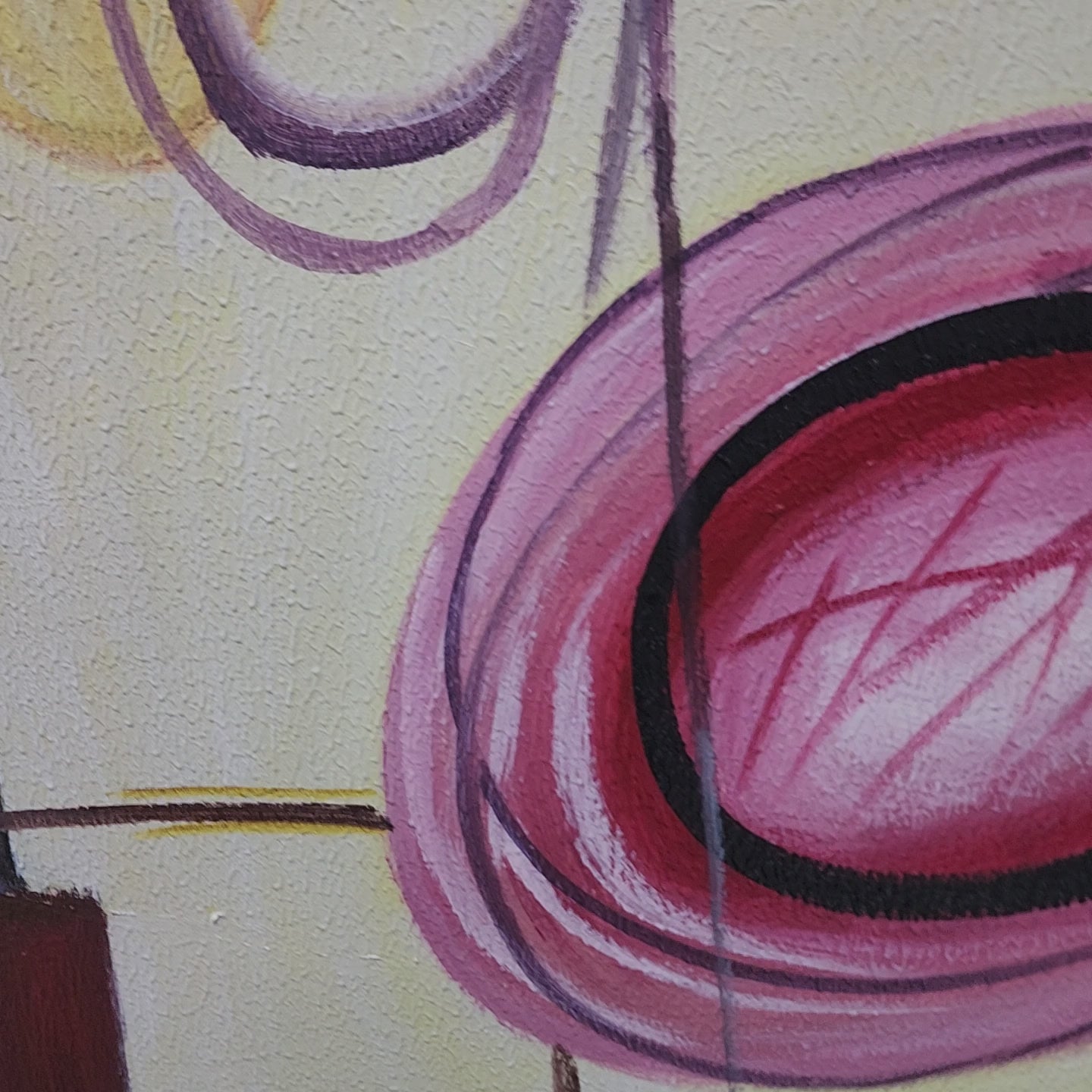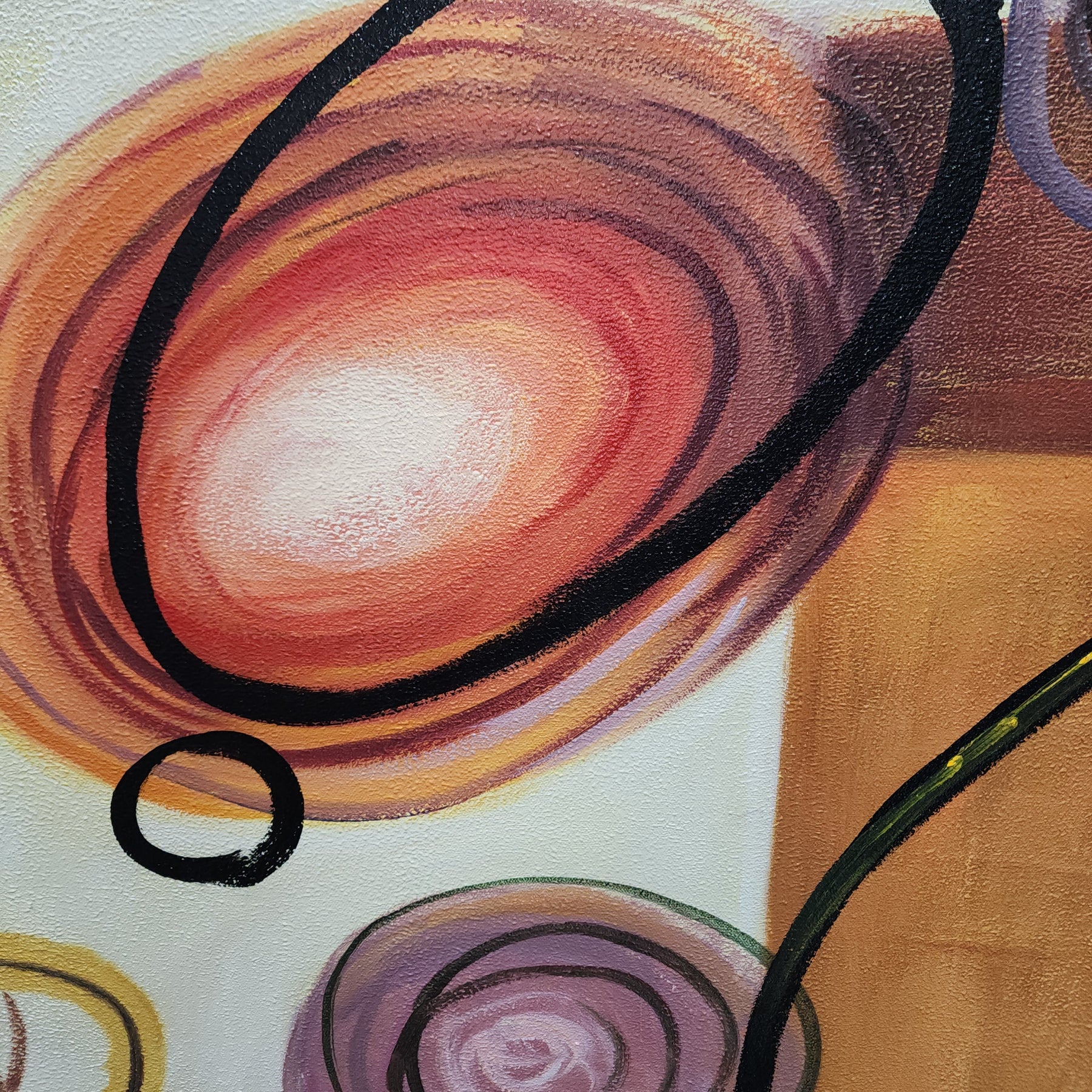 A vibrant set of two hand painted abstract artworks featuring playful circular forms, bold lines, and warm retro-inspired colour blocks. The dynamic movement and balanced composition make this pair a striking statement for any contemporary space. Size 50x70cm each.