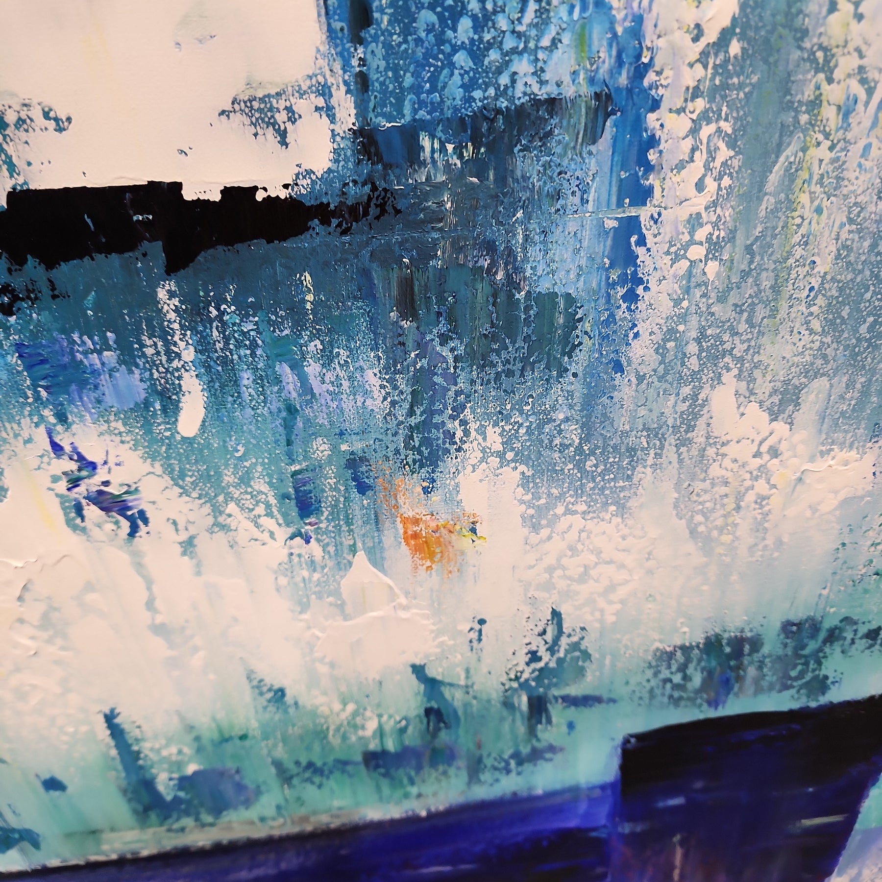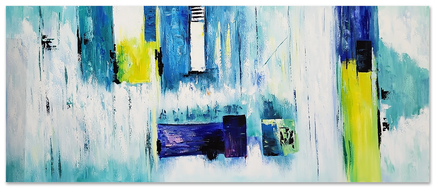 Stunning modern abstract featuring blue and yellow tones, in a large feature size 100x240cm.
