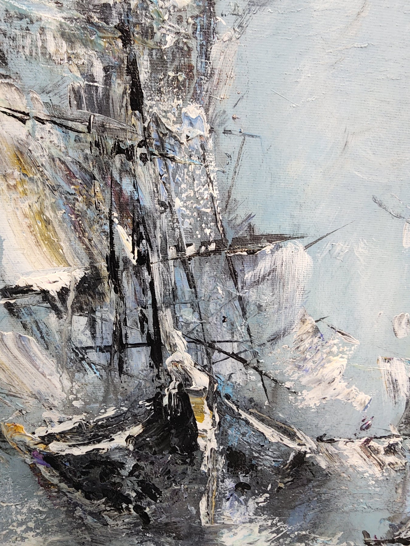 Textural painting of delicate flowers in soft shades of white, grey and silver.