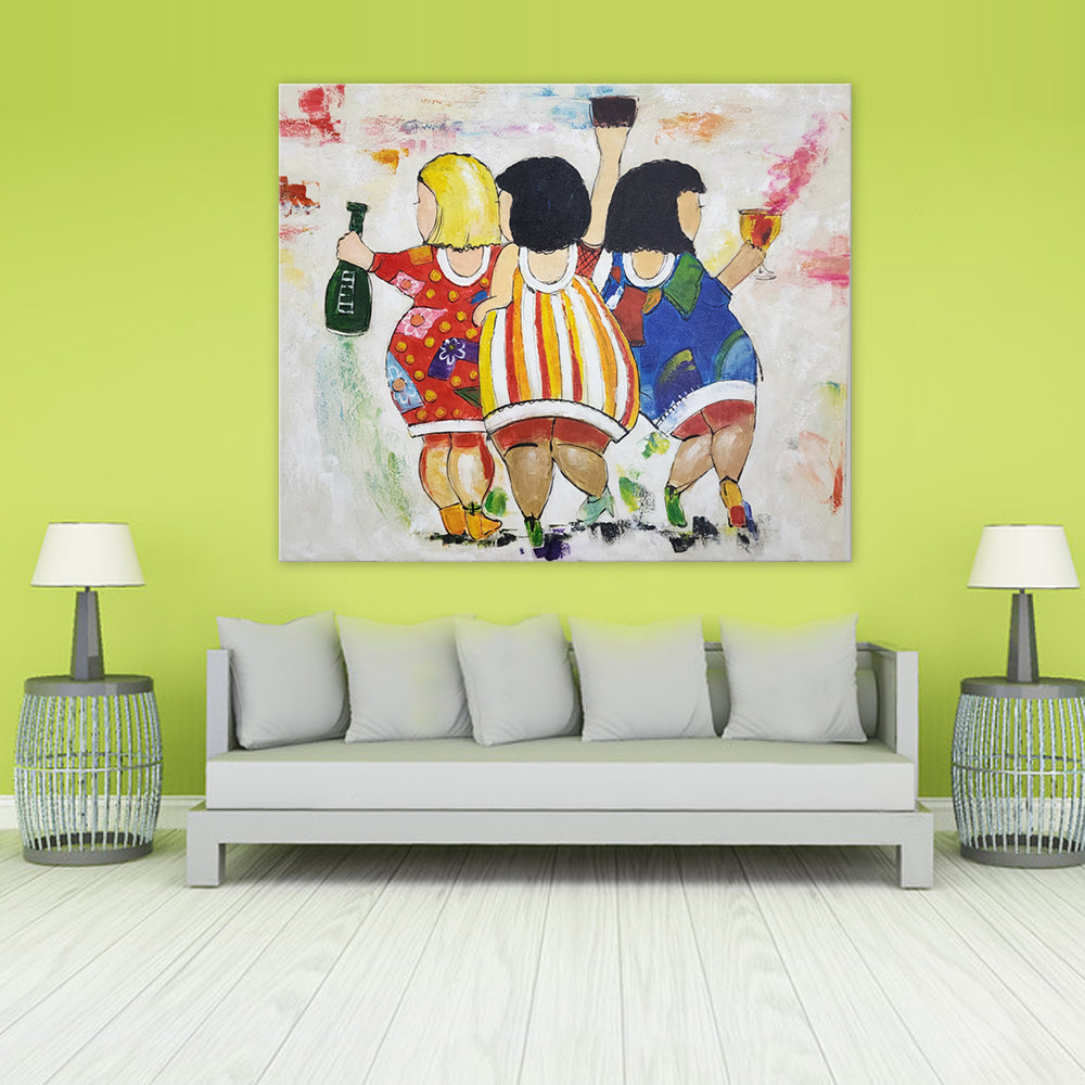 Tepid Divas - Quirky, Whimsical Painting Featuring Three Stylized Women At A Party, Size 100x120cm