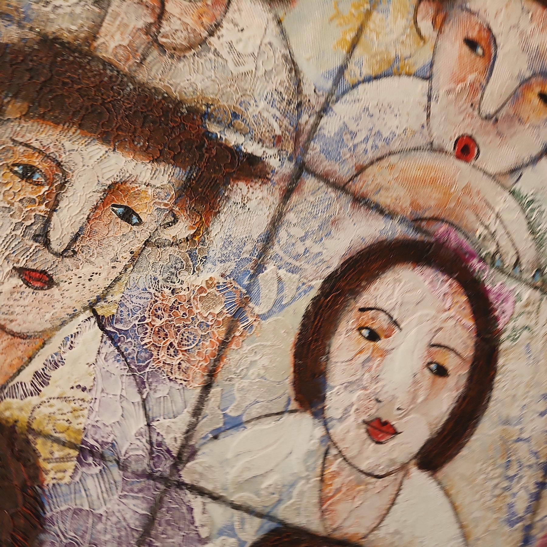 Highly textural hand painted artwork featuring several faces displaying quirky expressions, fitted in an Oak coloured frame. Size 100x120cm