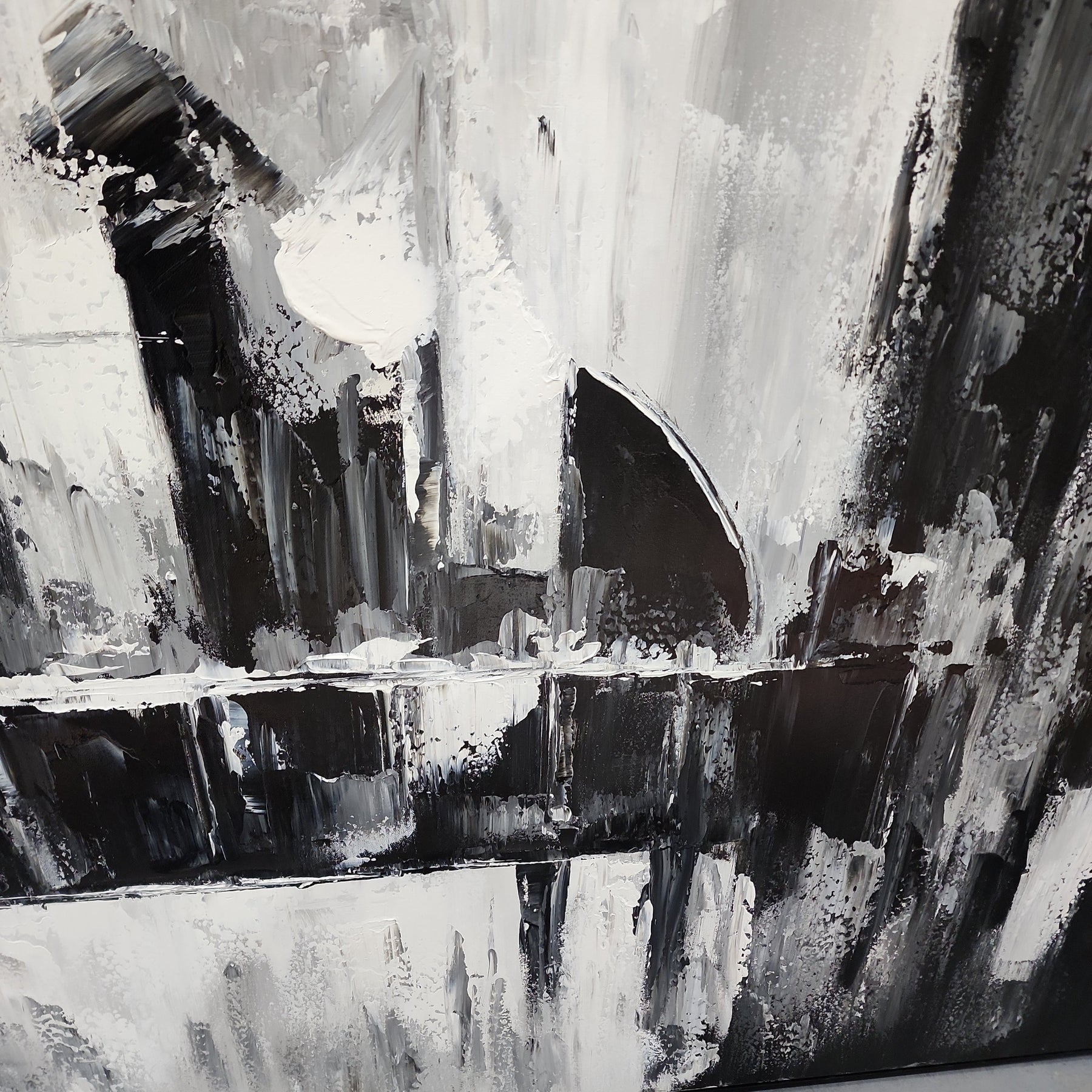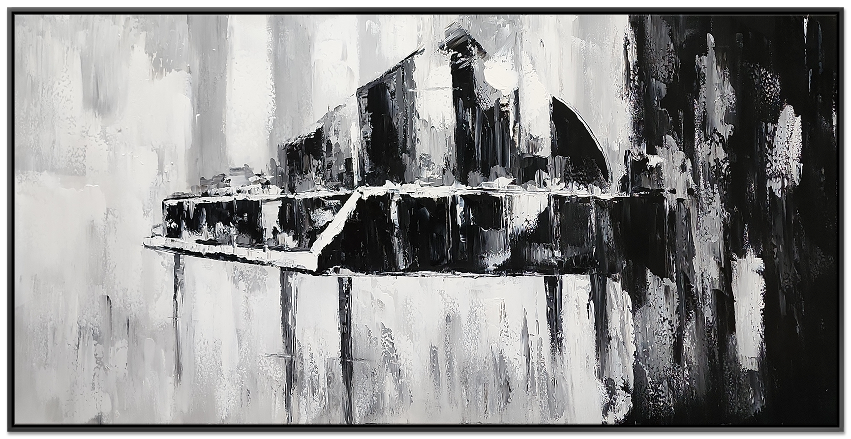 Striking Black and White Abstract featuring thick, textural painted elements, and finished with a high quality Black Shadow Frame. Size 100x200cm.