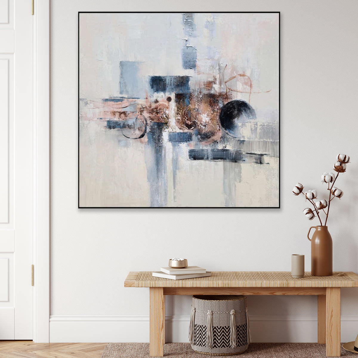 A modern embellished canvas print with layered textures and earthy tones, framed in a sleek black shadow frame, sized 90x90cm.