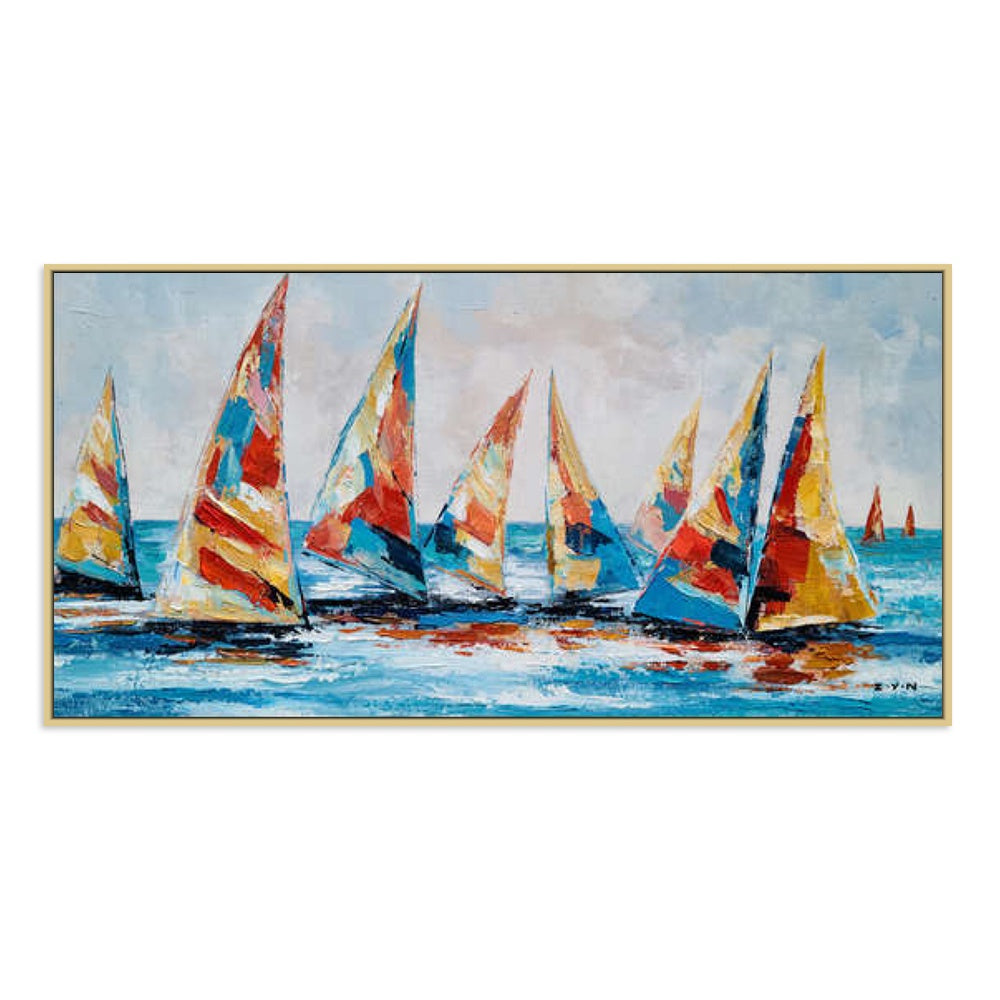 A lively embellished canvas print of vibrant sailboats racing across the water, filled with bold strokes of red, blue, and yellow, framed in an oak-coloured shadow frame. Available in sizes 60x120cm and 80x150cm.