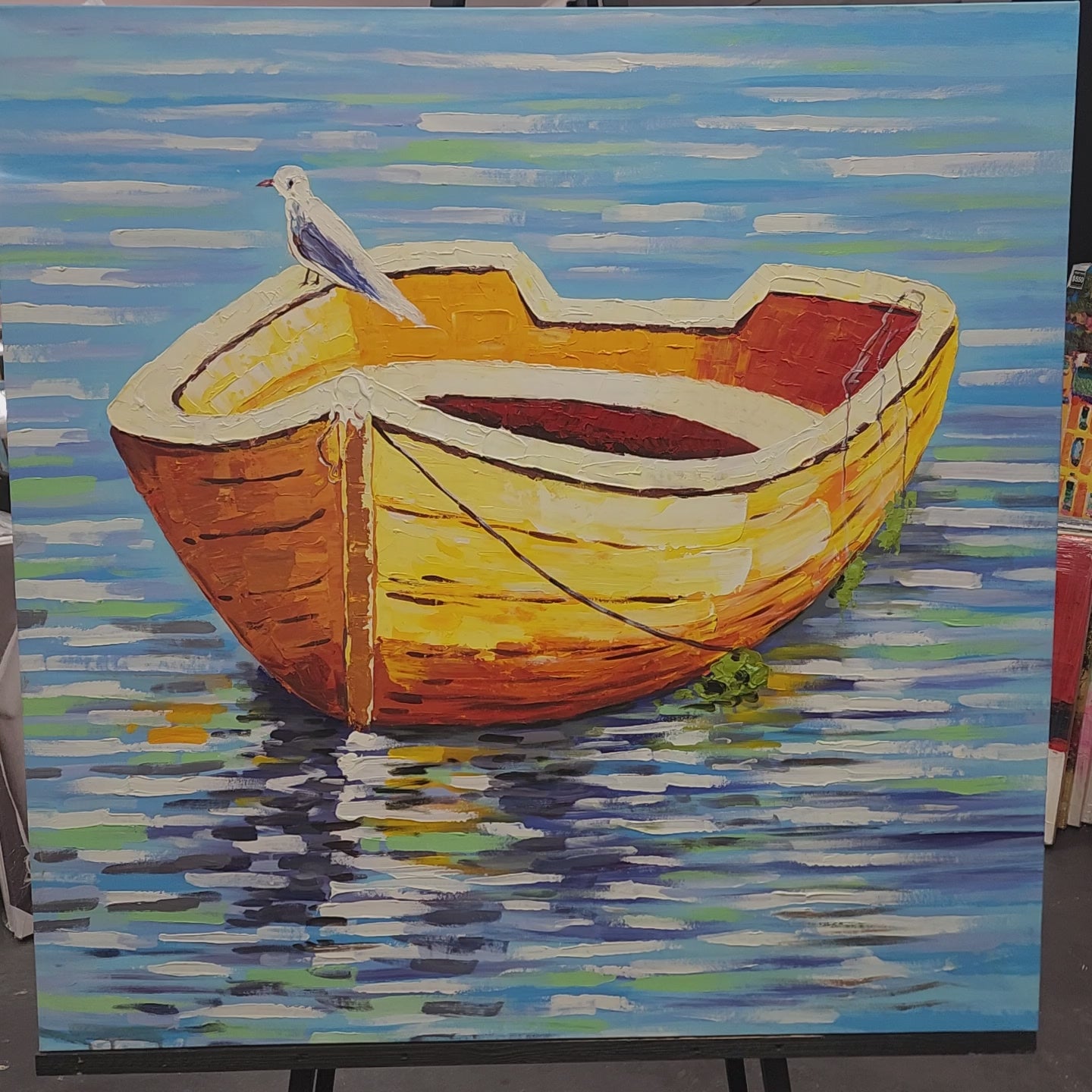 This serene painting captures a sunlit wooden boat gently floating on calm waters, accompanied by a solitary seagull perched atop. The rich textures and vibrant brushstrokes bring depth and movement to the scene, evoking a sense of peace and quiet escape. Gallery wrapped with a wire/string and ready to hang, this artwork brings a coastal charm to any space. Large Size 120x120cm.